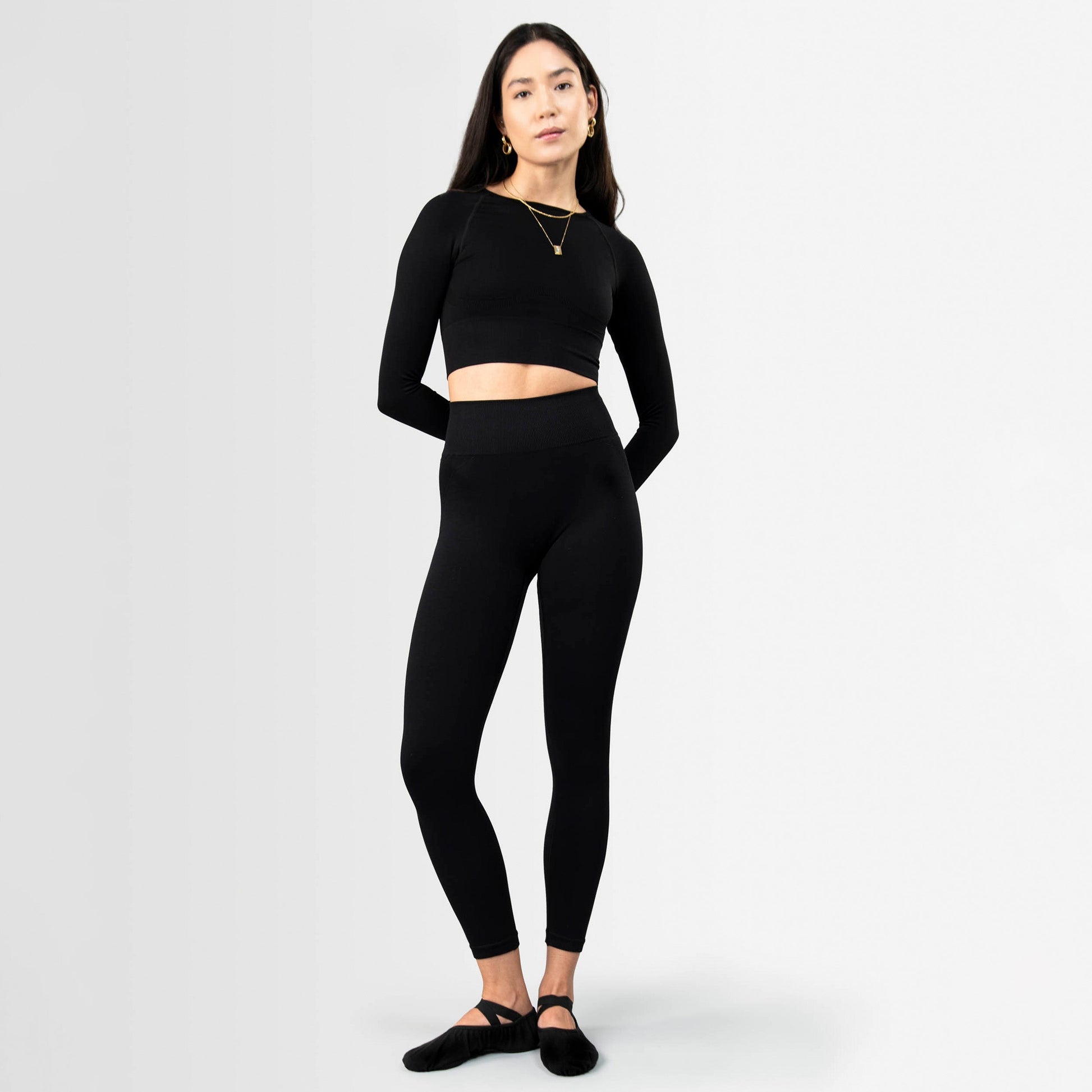 Cropped fit. Crew neck. Long sleeved. Seamless design.